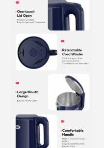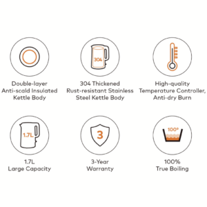 201 stainless steel body, rust-proof and more durableDouble anti-dry burn protection function is safer3-year warranty, durable and worry-freeDouble-layer heat preservation and anti-scald