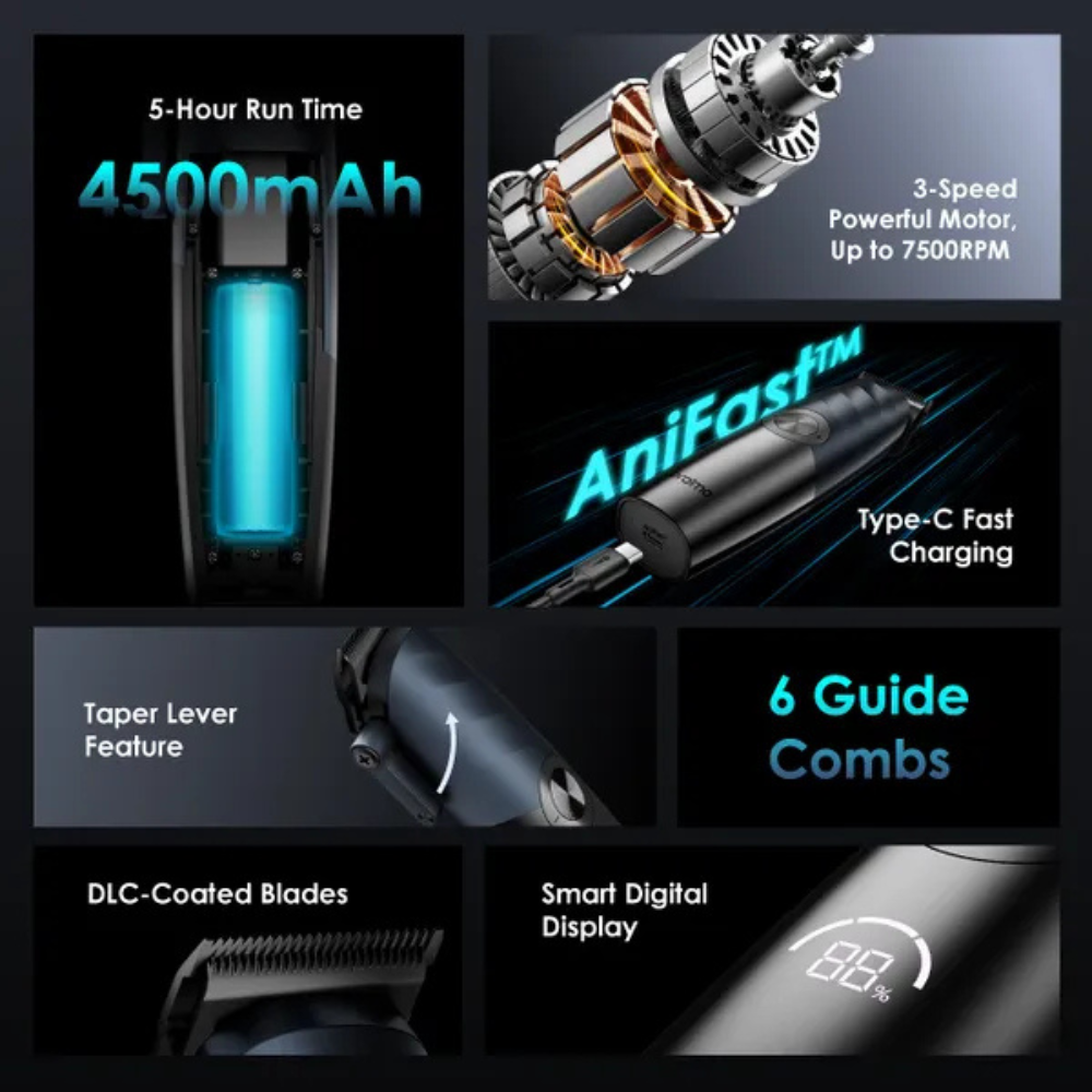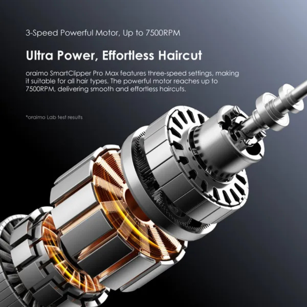 oraimo SmartClipper Pro Max features three-speed settings, making it suitable for all hair types. The powerful motor reaches up to 7500RPM, delivering smooth, and effortless haircuts.