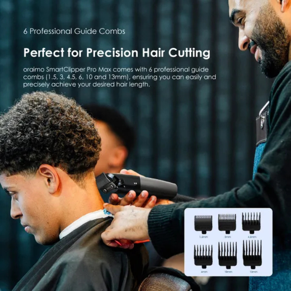 oraimo SmartClipper Pro Max comes with 6 professional guide combs (1.5, 3, 4.5, 6, 10 and 13mm), ensuring you can easily and precisely achieve your desired hair length.