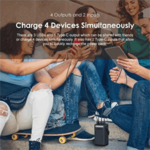 There are 3 USB outputs and 1 Type-C output which can be shared with friends or charge 4 devices at the same time. It is with 2 Type-C inputs allow you to recharge this power bank quickly.